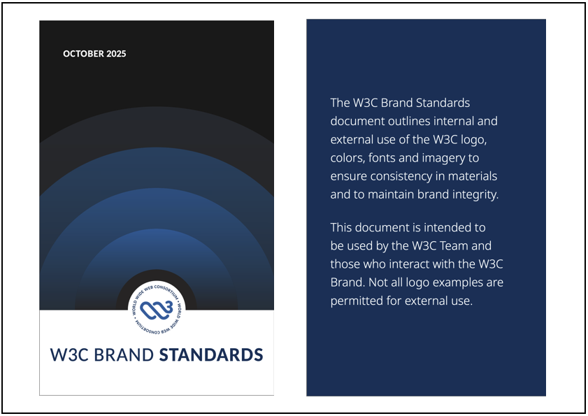 The W3C Brand Standards (EPUB format) outline internal and external use of the W3C logo, colors, fonts, typography and imagery to ensure consistency in materials and to maintain brand integrity.