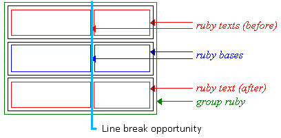 However ruby containers also establish a ruby formatting context that builds further structure around their segment of the inline formatting context. Ruby bases, ruby annotations, ruby base containers, and ruby annotation containers are internal ruby boxes: like internal table elements, they have specific roles in ruby layout, and participate in their ruby container’s ruby formatting context.