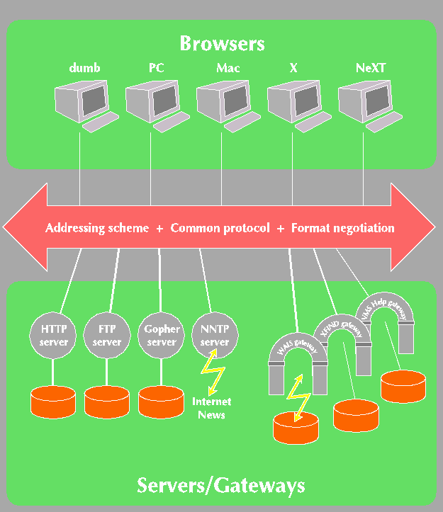 To allow the web to scale, it was designed without any centralized facility. Anyone can publish information, and anyone (authorized) can read it. There is no central control. To publish data you run a server, and to read data you run a client. All the clients and all the servers are connected to each other by the Internet. The W3 protocols and other standard protocols allow all clients to communicate with all servers.