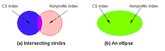 Intersection is probably not the ideal operation, since it could exclude a page very close to one focus but a little too far from the other, while including a page the maximum distance from each focus. Instead, we probably want to take the set of points where the sum of their distances from the foci is less than a constant; in other words, an ellipse.* We used our system to find empirically that paths from Yahoo's CS and public-interest indices met, appropriately, at Electronic Privacy Information Center. While we have defined the distance between two pages as the shortest path between them, other possible definitions would take into account the number of paths between two pages.
