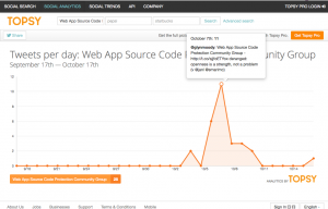 See for example this Topsy graph. It shows the number of tweets per day that mentioned “Web App Source Code Protection Community Group”: