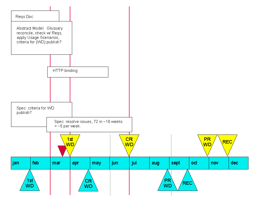 David F put up the schedule slide again. Need to publish by mid March. Obvious candidates Req, AM, Spec, or Glossary if separate. The spec is technically publishable, but some don't think it would be a good idea. We could make it a better proposal, but taking the spec and rolling the issue list (a snapshot of the issues) into it to show the world that there are still many issues. AM is a potential - we all seem to agree that it will be published at some time. Propose reconcile the glossary and publish as soon as possible. Taking it out of the requirements means to put into a document that will be published at the same time. Taking it out of a WD doesn't necessarily remove it from the public view. The heartbeat publications were set up when W3C WG's were less public, but we are very public. So, publications seem to imply more agreement rather than public face. Hence, we need to be careful about what we publish. What is the suggestion with the glossary? Do we all think that it needs to move to the AM? No clear answer and no clear WG feeling emerging. Reconciliation should happen independent of how it gets published. What is the upfront time to get it published now that it is already a WD? A few days only. DF recognizes some consensus in doing the work in the Requirements Doc and republishing it for our heartbeat req. Verbal for for yes. WG had decided we will publish a new Req Doc with an updated glossary. Henrik has already update the editor's copy on the w3c web site. By 3/7 all review. By 3/14 need the final document. Henrik points out that there are currently no outstanding issues against it. Martin owns the glossary. Stuart will meet with Gudgin to resolve the conflicts.