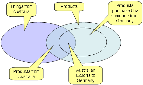 The left circle in Figure 4 describes the class of all things that have their origin in Australia. The right circle represents all instances of the product class. The intersection of the two big circles therefore represents the class of all instances that are products and "from Australia" at the same time, i.e. all Australian products. Illustrated by the small circle within the products circle, the class of those products purchased by someone from Germany is a subset of all products. Finally, the set of all Australian products that have been purchased by someone from Germany are represented by the intersection of all classes.