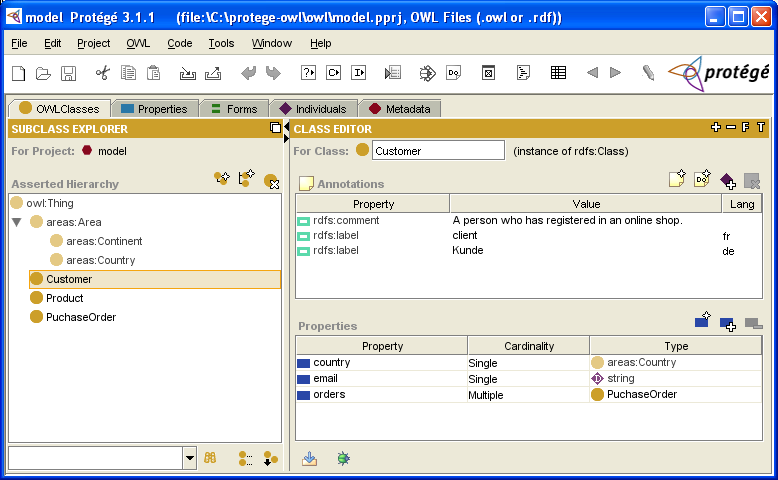 However, the specific customers and our online shop's localization to a specific country are application-specific and need to be custom-tailored. Such custom-tailoring can be achieved by adding specific subclasses or instances. If shared ontologies/domain models are not optimized for a specific application purpose and therefore need to be adapted or built from the scratch, then domain modeling tools (such as Protege, as shown in Figure 3) can be used. These tools are suitable for domain experts who have little or no training in programming languages. Essentially, these tools provide visual editors for classes and relationships, and allow users to create instances of these classes.