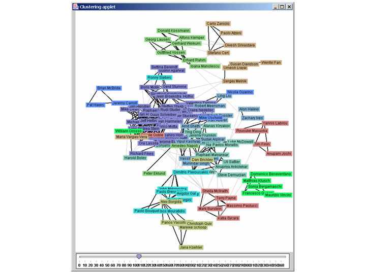 Again, the results have clear face validity. As an example, the previously mentioned group of researchers from the AIFB Institute of the University of Karlsruhe quickly emerges as a single cluster of the network. Interesting to note that this affiliation
