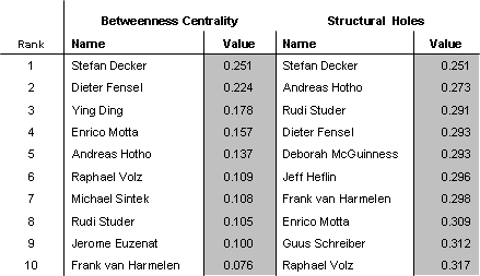 Second, there is cognitive evidence that the measures of degree and closeness centrality are successful in distinguishing the important members of the community. Ian Horrocks, Dieter Fensel, Frank van Harmelen have been the chairs of the three ISWC confe