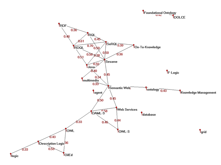 the lines below a certain threshold.) The resulting diagram is familiar to those who know the work of this research community (see Figure above). For example, it is well known that OWL-S and DAML-S are languages for the description of Web Services. It is