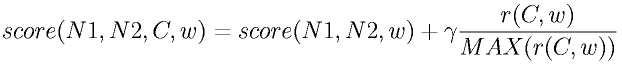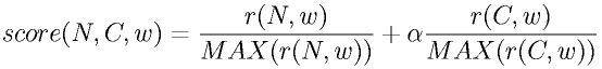 Therein, alpha denotes the relevance between the person and the context. For example, we can use r(N,C) as alpha. MAX(r(X,Y)) is the maximum value of the Jaccard coefficient in the term set W. We define the threshold for r(N,w) to exclude terms that are not relevant for a person, but that have strong relation to the context. The term ``w'' with the higher score(N,C,w) is considered to be a more relevant keyword for person ``N'' in context ``C''.