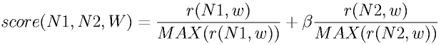 Therein, ``N1'' and ``N2'' denote each person's names in the relation. beta is the parameter of relevance between persons, such as r(N1,N2). This formula shows the relevance of person ``N1'''s term ``w'' in relation to person ``N2''.