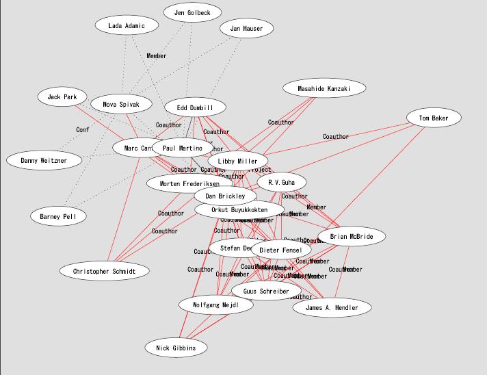 We are currently developing a novel method to extract a social network from the Web [8]. Figure.2 shows the social network of FOAF Workshop Program Committees. Along with keywords of a person, the keywords of the relation among persons yields semantics to the social network. By combining the social network with the keywords, we can comprehend information about nodes and edges on the network. More importantly it is possible to provide many services such as person recommendations or finding a community in the network.