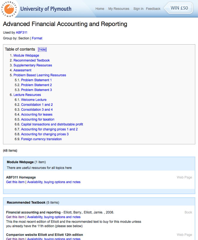 Resource Lists, or Course Reserves as they are known in the US, are collections of text books, journal articles, Web pages and/or audio visual content defined by instructors, intended to be companions for students to degree courses, modules or assignments. Traditionally, these were provided to the student as a paper handout comprising a list of citations, the intention being for the student to visit to the campus library or bookshop to obtain the resources.