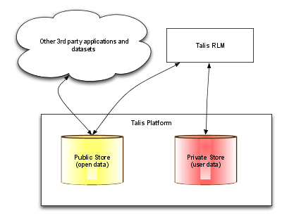 The system uses the Talis Platform [9] to store, index and query across its RDF data. The application makes use of a group of distinct stores to separate graphs with different concerns and levels of privacy (see Figure 3). For example, publicly linkable and discoverable data is stored in a different store from private user content or details, such as preferences, passwords or private study notes. Data from these stores can be merged within the system at run time when required. Using this approach encourages re-use of the public data by other applications. The full set of Talis Platform APIs, such as SPARQL and search capabilities, can be offered externally without exposing sensitive or private data.