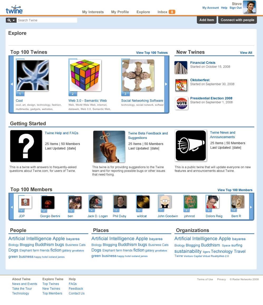 A “twine” is a place for collecting, sharing, organizing and keeping up with interests. It’s the next step beyond a file server, wiki, personal home page, or database. Users can create a twine for any group, team or community. Twines can be private and personal, private for groups, or public for groups and communities.