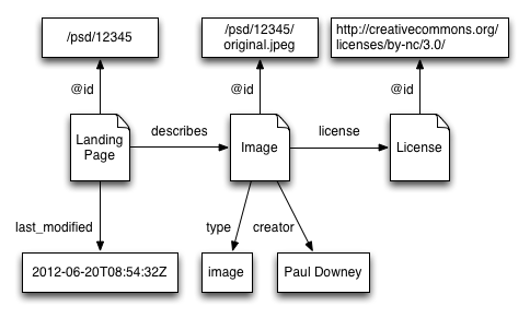 Unlike the previous example, here it is not the case that the content an application gets when it resolves the value of the @id property (http://photo.example.com/psd/12345) is an image — it is an HTML page. Similarly, the content of the HTML page is not created by Paul Downey — it is created by the photo sharing site. The HTML page is not available under the CC-by license — the photo sharing site holds the copyright. Thus the properties that are associated with the URI http://photo.example.com/psd/12345 within the data do not apply to the content provided at that URI, but to the image for which the HTML page is the landing page.