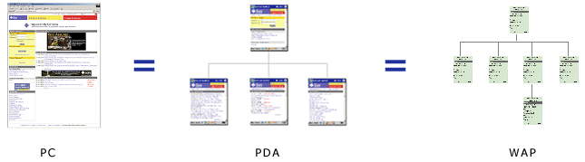 one information-rich PC page may map to four PDA pages and six WML pages.