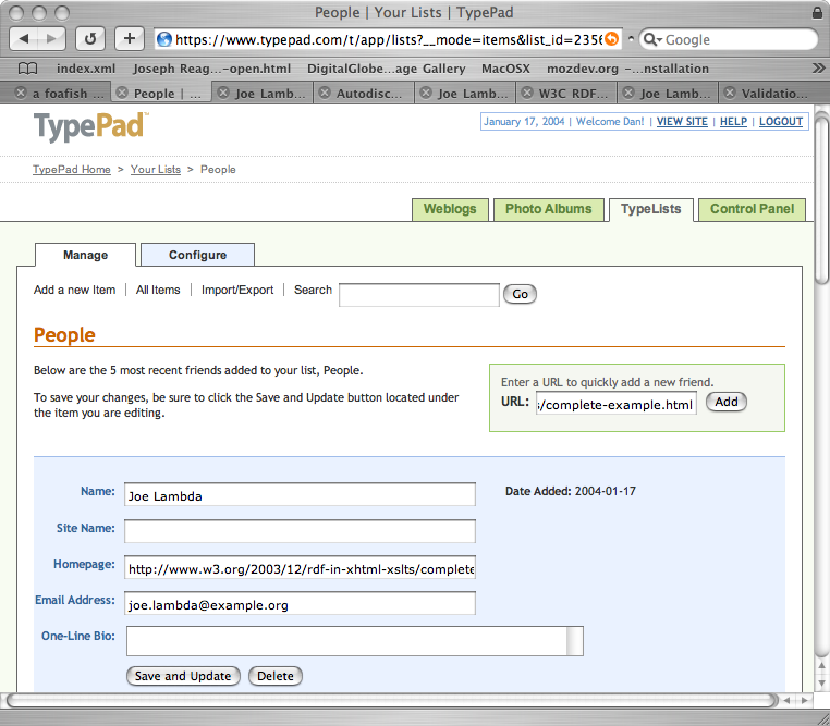 This page also uses FOAF autodiscovery (ie. link rel="meta" conventions in the document's head) to link to the derrived RDF data. This allows tools such as FOAF Explorer or the TypePad weblogging service (see screenshot of "add a friend" facility) to exploit a machine-readable view of the data in this document.