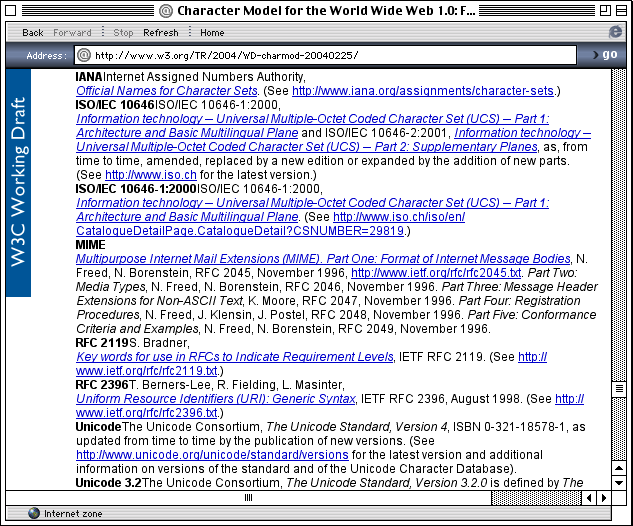 Decision: Noted We have classified this comment as 'noted'. This means that while it raises a valid point, we have decided not to change the specification. The fact that the Web can be seen as a single, very large application (in the sense that data flows through all the pieces without any total boundaries) is indeed very important in particular for the use of Unicode as a common reference point in the Character Model. Without such a reference, binary data would be exchanged without the chance to be able to compare two text strings (e.g. if they are in incompatible encodings). This also increases the requirement for Web-wide agreements on things such as counting characters,...