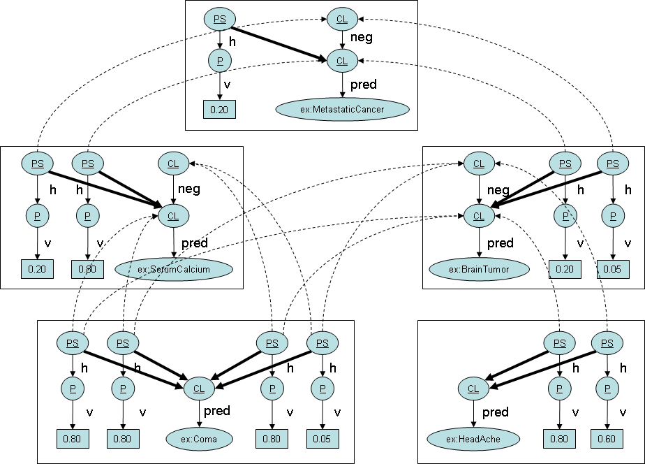 The proposal in this paper is still in its experimental stage and needs public review and discussion. I am now writing converting rules from a RDF graph like the one above to the corresponding Bayesian network in XMLBIF format, using cwm.