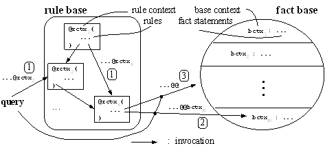 To gain experiences in managing, processing, and querying domain artefacts we developed the repository prototype ODIS (Ontology-based Domain Repository) which is built around TRIPLE. Furthermore, ODIS introduces some syntactical and symantical extensions of TRIPLE related to the requirements above. To support requirement 1 ODIS introduces the separation of the rule base and the fact base inspired by the distinction between intensional resp. extensional predicates from deductive databases. More precisely, for statements we introduce a two-valued sixth dimension. Figure 2 shows the intended architecture wrt. this construct. Place 1 in this figure shows the classical usage of contexts to modularize the whole rule set. Places 2 and 3 show the usage of the '@@'-construct which express the referencing of statements only within the fact base.