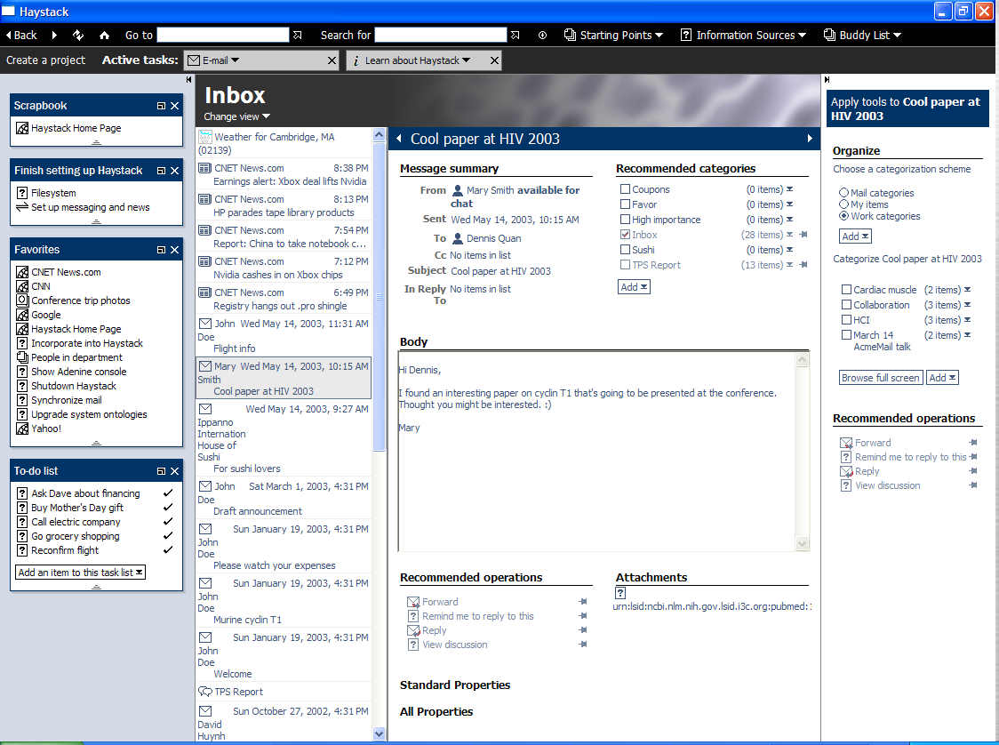 Haystack - User configurable universal information client Personalization of information management RDF model represents everything - data, layout, preferences, etc. Huge benefits from universal model of information |