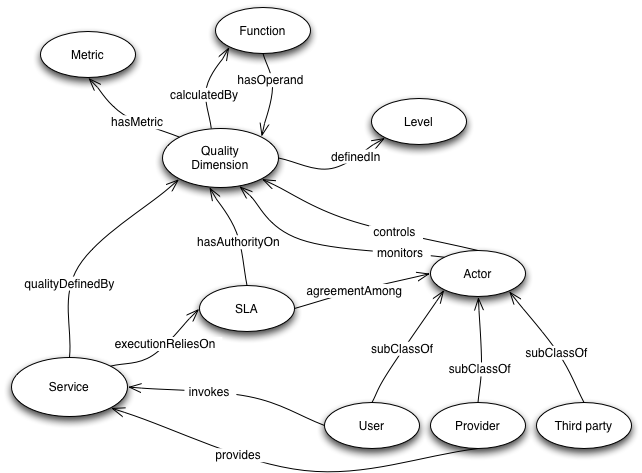 The second part of our quality model allows defining in which way the service quality can be described according to the quality dimensions previously formalized. First of all, invokes and provides define the relationships among services and users and providers, namely. Actually, before invoking a given service, user and provider should agree on a set of quality dimensions values. Such an agreement results in a contract usually called Service Level Agreement (SLA), where third parties might be involved to monitor the quality dimensions. The following roles aim at supporting this phase: