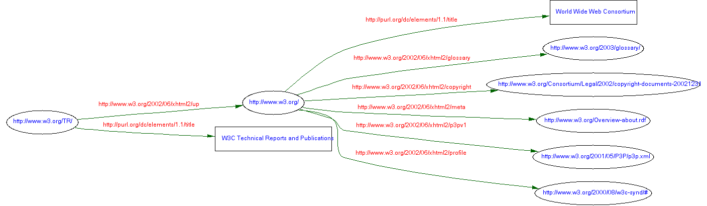The RDF representation of these link types uses the link name as a local name (and human-readable rdfs:label) for each RDF property. The rdfs:domain and rdfs:range of each property are considered to be the class InformationResource, a utility class representing information resources as defined by the Architecture of the World Wide Web, Volume One W3C Recommendation ([WebArch]). Note that this is an interpretation of the XHTML 2.0 design that has not been formally confirmed by the HTML Working Group. Note that non-HTML, non-XML documents can be inter-related using the link types described here (eg. Javascript, CSS).