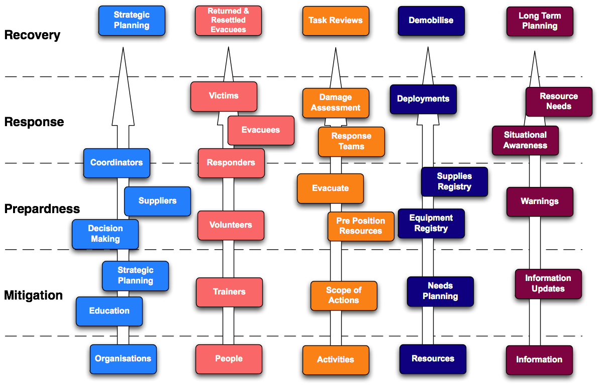 The Phased Framework takes a different more formal approach from the previous examples in that it views the four key phases of emergency management as separate (but related) activities and looks at how key entities (Organisations, People, Activities, Resources, Information) evolve through these phases (over time). The phases include: