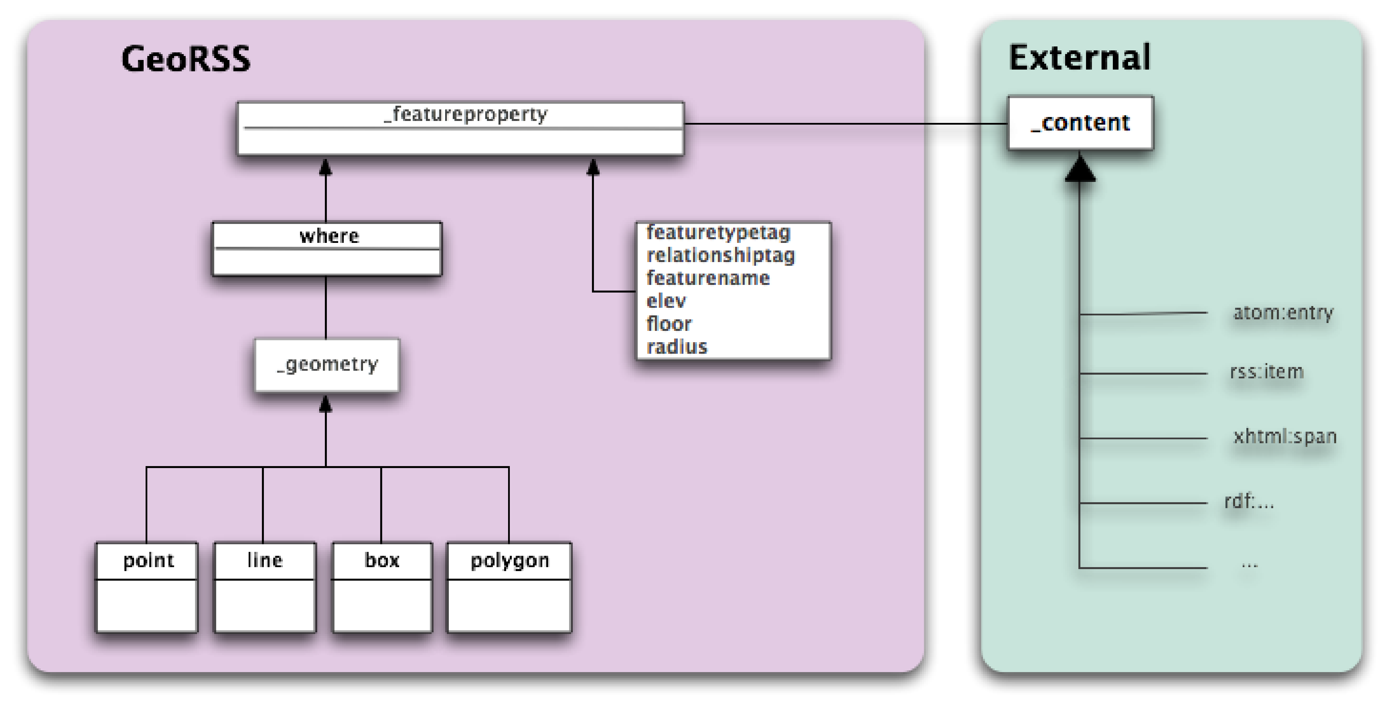 Subclasses of _geometry include gml:Point, gml:Linestring, gml:Polygon, and gml:Envelope after the corresponding GML objects. The properties of these classes are a subset of the corresponding properties defined in the GML model and schema. This represents GeoRSS GML.Other subproperties of geo:where represent GeoRSS Simple and include geo:Point, geo:Line, geo:Polygon, geo:Circle, and geo:Box. These properties each take a literal list of doubles as their range, but are equivalent in definition to (are a shorthand for) geo:where plus the corresponding GeoRSS GML classes and their properties.