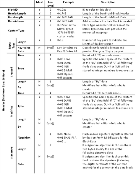 A SemProM block consists of block header and block data. The data block will be stored separately from the block header in another storage area. The data in the block header is coded binary and stored in Big Endian Byte order (Network Byte Order).