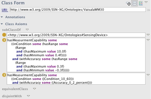 It's basically as described above, except the ranges and values are based on the same example done in the MMI Device ontology. Note that the MMI ontology models a particular sensor instance (wind_sensor_wm30_instance_1) using OWL individuals, whereas the example here models the type of all WM30 sensors setting out the accuracy for the whole class using OWL concepts. Thus, using the model from this example, a particular instance of the VaisalaWM30 concept would have this accuracy information without having to specify it explicitly - the MMI example discusses how the same could be done in that ontology.