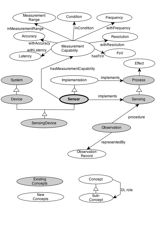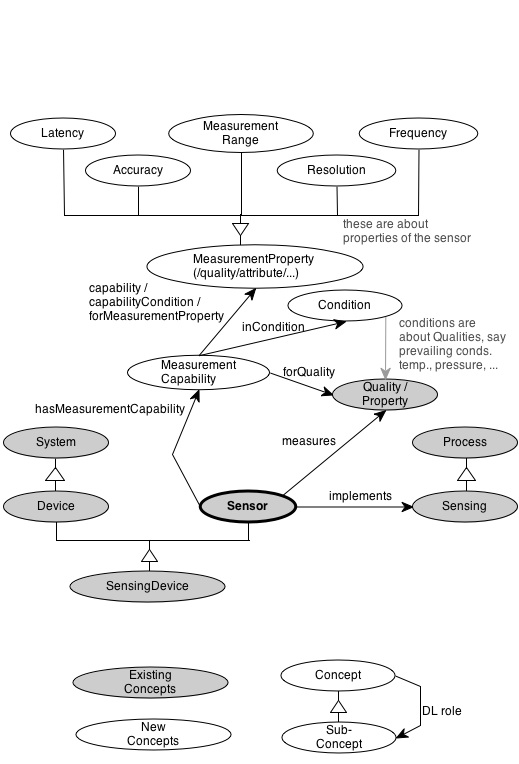 - Laurent and I discussed linking the MeasurementCapabilities to the qualities they refer to - useful if the sensor measures more than one Quality. With this I would suggest the DL constraint “hasMeasurementCapability o forQuality <= measures”. Note the we don’t yet have anything like “measures” in the ontology - we haven’t yet directly linked sensors to what they measure; it can be done through the observations they can make, but not yet directly. Again the constraint could be something like “INV(procedure) o observedProperty <= measures (we have to be mindful though that there are restrictions on using role composition in OWL2; it’s not a problem for these defs, but it affects how the roles can be used later on).