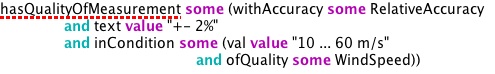 These three together state the bounds of the accuracy of the sensor in the two wind conditions. They would be part of the Tbox specification of a group of concepts that define the WM30. Instances of this could be added as Abox individuals. The Abox individuals might have for example a location and deployment information, but wouldn’t need to specify anything for accuracy as the existence of this part of the instance's specification is implied by the Tbox definitions above.