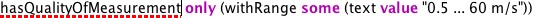 To make the example more complete we could add units of measurement to the values and indicate that the ranges we are talking about are wind speed (as is done in the version above). Though the point isn't to show how these things could/should be encoded, but rather to show how the modelling of accuracy and associated conditions works - i.e. it's just about the model at the top of the page and not ranges, values, uom, etc. In reality units and values should be encoded by including an appropriate ontology modelling those, for this purpose the other parts are more important.