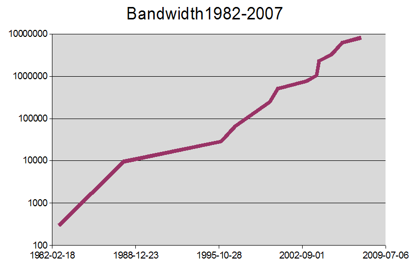 What is less well-known is that bandwidth is also growing exponentially at constant cost, but the doubling time is 1 year!