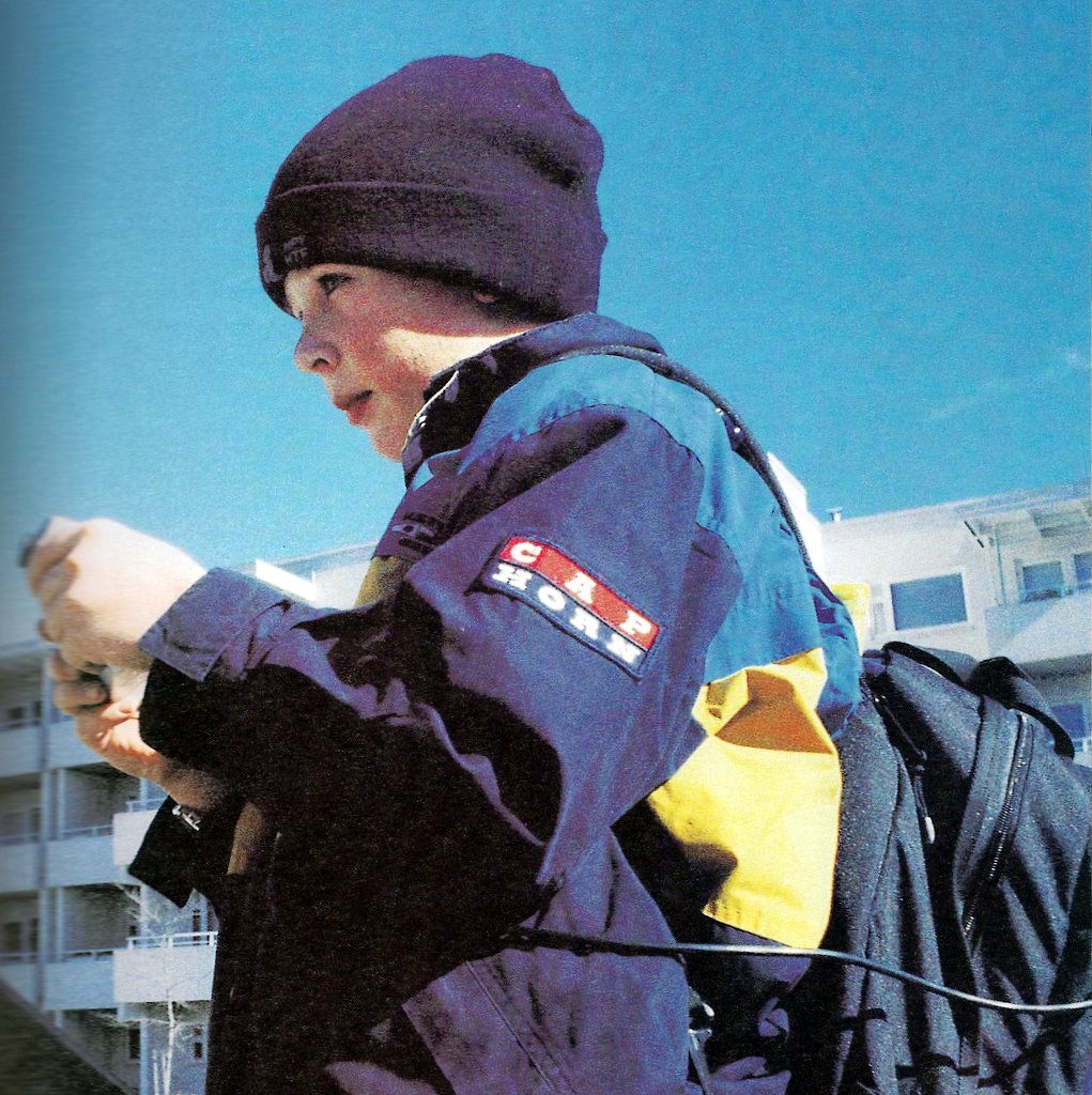 Here is a boy trying out the test camera. The electronics representing the mobile phone are in the backpack.