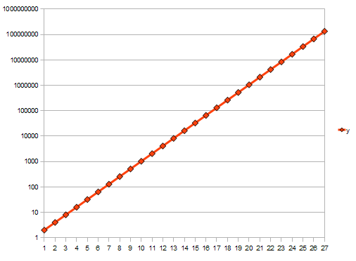 Note that a doubling per 2 years is the same as a 10 fold increase every 6 and a bit years; we call a 10-fold ancrease an order of magnitude change.