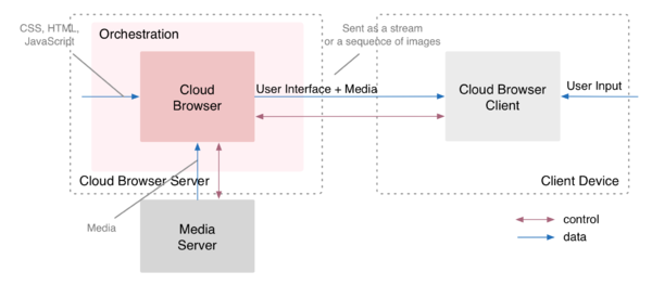 In a Cloud Browser architecture the execution is done on a server and the result is sent down to a so-called Cloud Browser Client. This Cloud Browser Client is only responsible for displaying the stream and providing essential information such as key strokes. The latter is depending on the infrastructure. In the future there may be a specification how to exchange this information for example with json-dl based on a generic communication mechanisms such as websockets or webRTC. It will be transport and format agnostic. In other words, it will be vendor specific or may be standardised outside W3C. Furthermore, the Cloud Browser Client doesn't have any context. Namely, it will connect to the orchestration and display the result. This will make sure that all the logic is within the cloud and no necessary updates are needed on the client device. This is also a fundamental difference with a Transformation Proxy, where the context still exists on the client device. An easy way to visualise the Cloud Browser Client is to see it as a remote display which also acts as gateway to send essential information to the Cloud Browser.