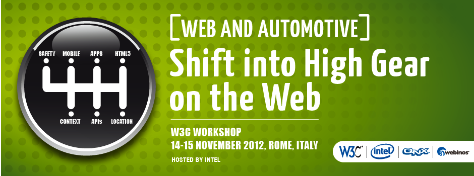 On the 14 and 15 November 2012, W3C (the World Wide Web Consortium) held a workshop on Web and Automotive (Shift into High Gear on the Web). The discussions focused on opportunities and challenges for exploiting Web technologies within the car, and what kinds of standards work may be needed to realise the potential.