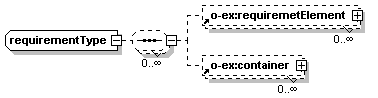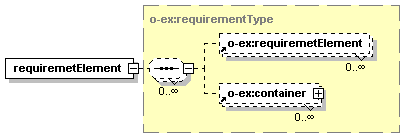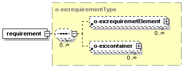 | source | <xsd:complexType name="requirementType"> <xsd:sequence minOccurs="0" maxOccurs="unbounded"> <xsd:element ref="o-ex:requiremetElement" minOccurs="0" maxOccurs="unbounded"/> <xsd:element ref="o-ex:container" minOccurs="0" maxOccurs="unbounded"/> </xsd:sequence> </xsd:complexType> |