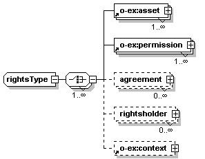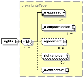 | source | <xsd:complexType name="rightsType"> <xsd:choice maxOccurs="unbounded"> <xsd:element ref="o-ex:asset" maxOccurs="unbounded"/> <xsd:element ref="o-ex:permission" maxOccurs="unbounded"/> <xsd:element name="agreement" minOccurs="0" maxOccurs="unbounded"> <xsd:complexType> <xsd:complexContent> <xsd:extension base="o-ex:agreementType"> <xsd:attributeGroup ref="o-ex:IDGroup"/> </xsd:extension> </xsd:complexContent> </xsd:complexType> </xsd:element> <xsd:element name="rightsholder" minOccurs="0" maxOccurs="unbounded"> <xsd:complexType> <xsd:complexContent> <xsd:extension base="o-ex:rightsHolderType"> <xsd:attributeGroup ref="o-ex:IDGroup"/> </xsd:extension> </xsd:complexContent> </xsd:complexType> </xsd:element> <xsd:element ref="o-ex:context" minOccurs="0"/> </xsd:choice> </xsd:complexType> |