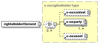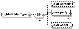 | source | <xsd:complexType name="rightsHolderType"> <xsd:choice minOccurs="0" maxOccurs="unbounded"> <xsd:element ref="o-ex:context" minOccurs="0"/> <xsd:element ref="o-ex:party" maxOccurs="unbounded"/> <xsd:element ref="o-ex:asset" minOccurs="0"/> </xsd:choice> </xsd:complexType> |