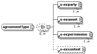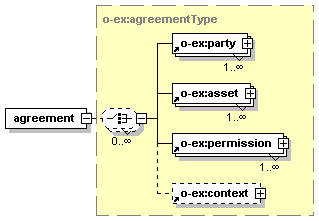 | source | <xsd:complexType name="agreementType"> <xsd:choice minOccurs="0" maxOccurs="unbounded"> <xsd:element ref="o-ex:party" maxOccurs="unbounded"/> <xsd:element ref="o-ex:asset" maxOccurs="unbounded"/> <xsd:element ref="o-ex:permission" maxOccurs="unbounded"/> <xsd:element ref="o-ex:context" minOccurs="0"/> </xsd:choice> </xsd:complexType> |