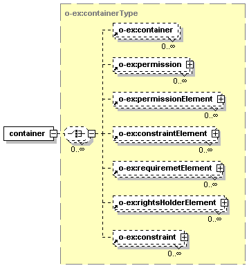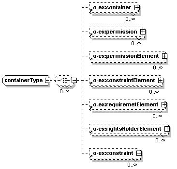 | source | <xsd:complexType name="containerType"> <xsd:choice minOccurs="0" maxOccurs="unbounded"> <xsd:element ref="o-ex:container" minOccurs="0" maxOccurs="unbounded"/> <xsd:element ref="o-ex:permission" minOccurs="0" maxOccurs="unbounded"/> <xsd:element ref="o-ex:permissionElement" minOccurs="0" maxOccurs="unbounded"/> <xsd:element ref="o-ex:constraintElement" minOccurs="0" maxOccurs="unbounded"/> <xsd:element ref="o-ex:requiremetElement" minOccurs="0" maxOccurs="unbounded"/> <xsd:element ref="o-ex:rightsHolderElement" minOccurs="0" maxOccurs="unbounded"/> <xsd:element ref="o-ex:constraint" minOccurs="0" maxOccurs="unbounded"/> </xsd:choice> </xsd:complexType> |