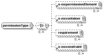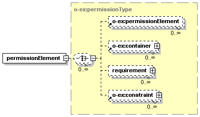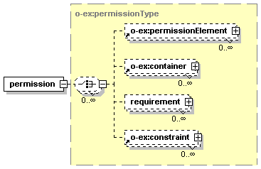 | source | <xsd:complexType name="permissionType"> <xsd:choice minOccurs="0" maxOccurs="unbounded"> <xsd:element ref="o-ex:permissionElement" minOccurs="0" maxOccurs="unbounded"/> <xsd:element ref="o-ex:container" minOccurs="0" maxOccurs="unbounded"/> <xsd:element name="requirement" minOccurs="0" maxOccurs="unbounded"> <xsd:complexType> <xsd:complexContent> <xsd:extension base="o-ex:requirementType"> <xsd:attributeGroup ref="o-ex:IDGroup"/> </xsd:extension> </xsd:complexContent> </xsd:complexType> </xsd:element> <xsd:element ref="o-ex:constraint" minOccurs="0" maxOccurs="unbounded"/> </xsd:choice> </xsd:complexType> |