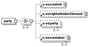 | source | <xsd:element name="party"> <xsd:complexType> <xsd:choice minOccurs="0" maxOccurs="unbounded"> <xsd:element ref="o-ex:context" minOccurs="0"/> <xsd:element ref="o-ex:rightsHolderElement" minOccurs="0"/> <xsd:element ref="o-ex:party" minOccurs="0" maxOccurs="unbounded"/> <xsd:element ref="o-ex:container" minOccurs="0" maxOccurs="unbounded"/> </xsd:choice> <xsd:attributeGroup ref="o-ex:IDGroup"/> </xsd:complexType> </xsd:element> |