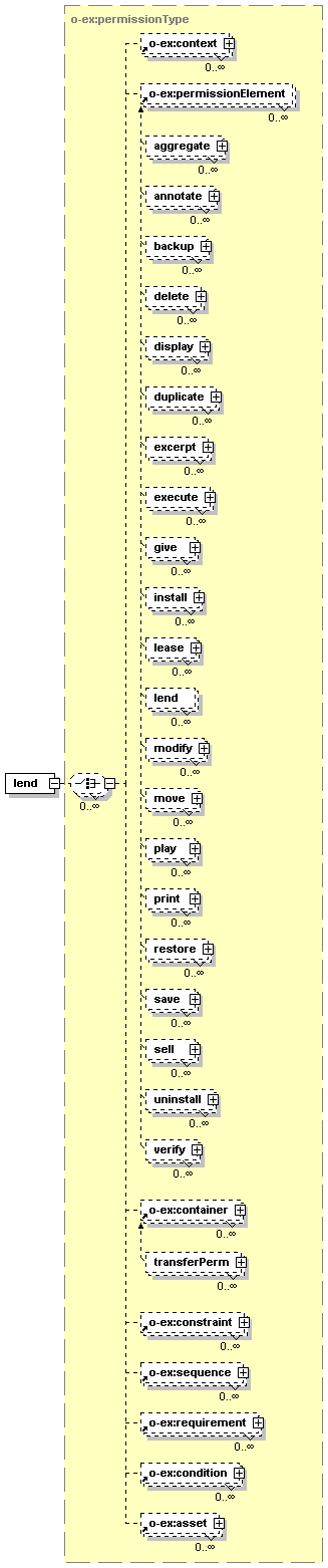 | source | <xsd:element name="lend" type="o-ex:permissionType" substitutionGroup="o-ex:permissionElement"/> |