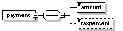 | source | <xsd:element name="payment"> <xsd:complexType> <xsd:sequence> <xsd:element name="amount"> <xsd:complexType> <xsd:simpleContent> <xsd:extension base="xsd:decimal"> <xsd:attribute name="currency" type="xsd:NMTOKEN" use="required"/> </xsd:extension> </xsd:simpleContent> </xsd:complexType> </xsd:element> <xsd:element name="taxpercent" minOccurs="0"> <xsd:complexType> <xsd:simpleContent> <xsd:extension base="xsd:decimal"> <xsd:attribute name="code" type="xsd:NMTOKEN" use="required"/> </xsd:extension> </xsd:simpleContent> </xsd:complexType> </xsd:element> </xsd:sequence> </xsd:complexType> </xsd:element> |