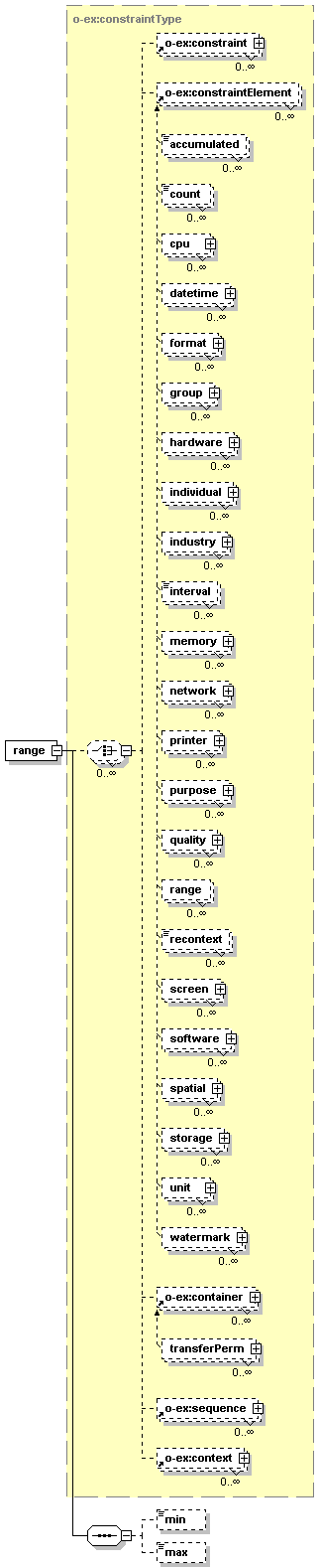 | source | <xsd:element name="range" substitutionGroup="o-ex:constraintElement"> <xsd:complexType> <xsd:complexContent> <xsd:extension base="o-ex:constraintType"> <xsd:sequence> <xsd:element name="min" type="xsd:decimal" minOccurs="0"/> <xsd:element name="max" type="xsd:decimal" minOccurs="0"/> </xsd:sequence> </xsd:extension> </xsd:complexContent> </xsd:complexType> </xsd:element> |