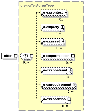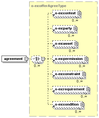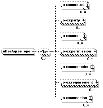 | source | <xsd:complexType name="offerAgreeType"> <xsd:choice minOccurs="0" maxOccurs="unbounded"> <xsd:element ref="o-ex:context" minOccurs="0" maxOccurs="unbounded"/> <xsd:element ref="o-ex:party" minOccurs="0" maxOccurs="unbounded"/> <xsd:element ref="o-ex:asset" minOccurs="0" maxOccurs="unbounded"/> <xsd:element ref="o-ex:permission" minOccurs="0" maxOccurs="unbounded"/> <xsd:element ref="o-ex:constraint" minOccurs="0" maxOccurs="unbounded"/> <xsd:element ref="o-ex:requirement" minOccurs="0" maxOccurs="unbounded"/> <xsd:element ref="o-ex:condition" minOccurs="0" maxOccurs="unbounded"/> </xsd:choice> </xsd:complexType> |