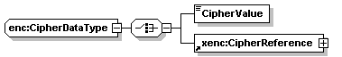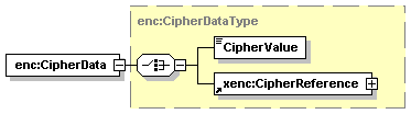 | source | <xsd:complexType name="CipherDataType"> <xsd:choice> <xsd:element name="CipherValue" type="base64Binary"/> <xsd:element ref="xenc:CipherReference"/> </xsd:choice> </xsd:complexType> |